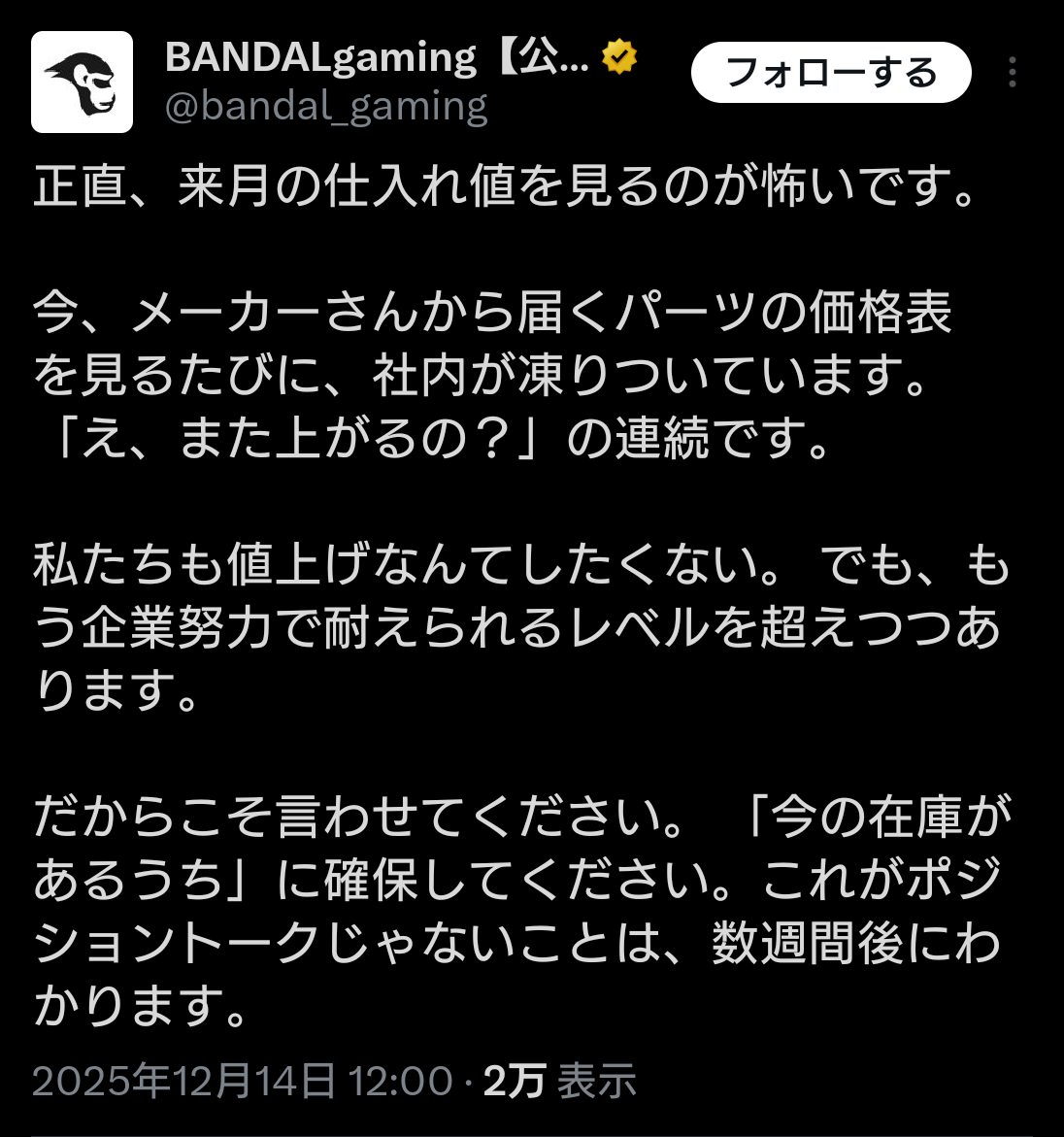 | … | 2825/12/15(月)01:58:07No.1382644778そうだねx15>あまり言われてないけど一般企業の社員用PCの仕入れとかにも影響凄そう |