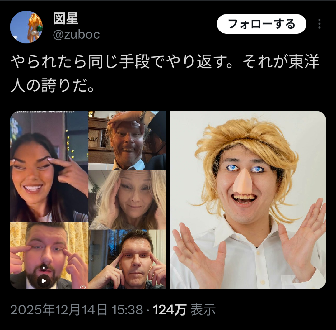 | … | 425/12/15(月)06:58:45No.1382660644そうだねx62右やっても「白人になりたいのね⋯かわうそ」されてるの笑える |