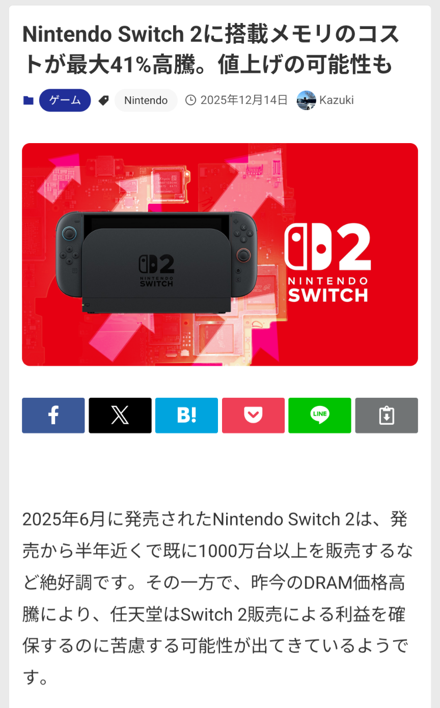 | … | 725/12/15(月)19:31:28No.1382824409そうだねx11>メモリ値上げはPCの問題だけでスマホやゲーム機は関係ないって「」が言ってたのに |