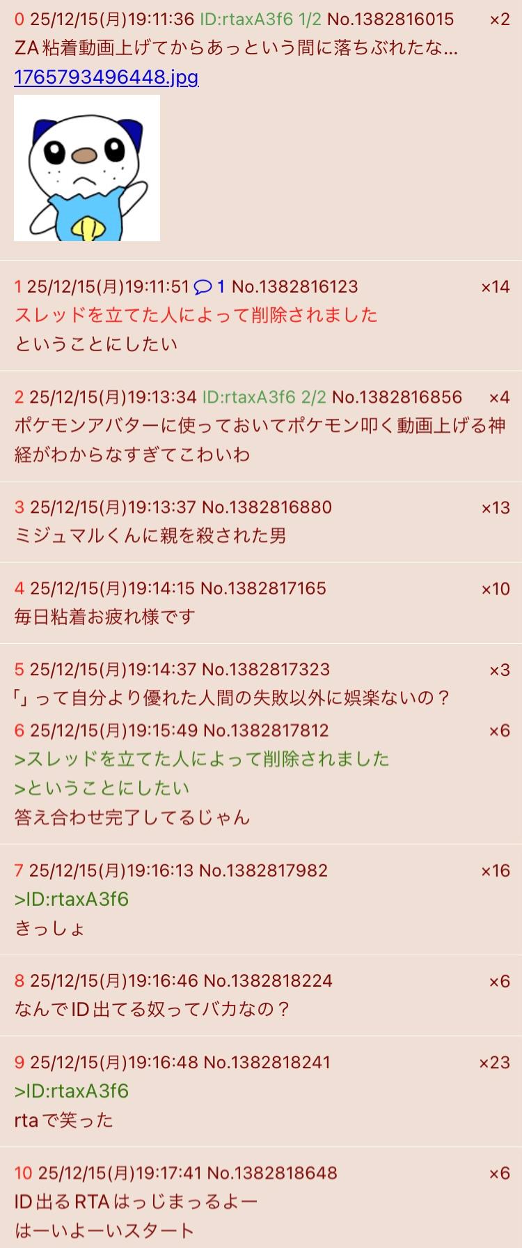 | … | 26925/12/15(月)22:03:37No.1382890221そうだねx6ちなみに日中のミジュマルくんスレ立った時はID:JrDPBfZwくんいなかったので平和に語れてました |