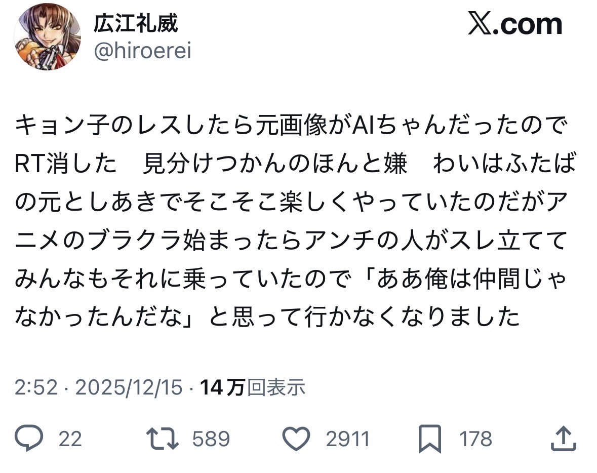 | … | 40025/12/15(月)23:09:16No.1382918692+スレ画の場合共感というか僅かでも気に入らないとブロックするので… |