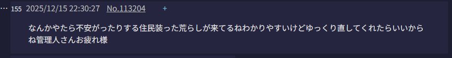 | … | 6625/12/16(火)01:12:02No.1382959941+>「管理人さんの悪口を言うな!!!管理人さんに感謝しろ!!!」 |