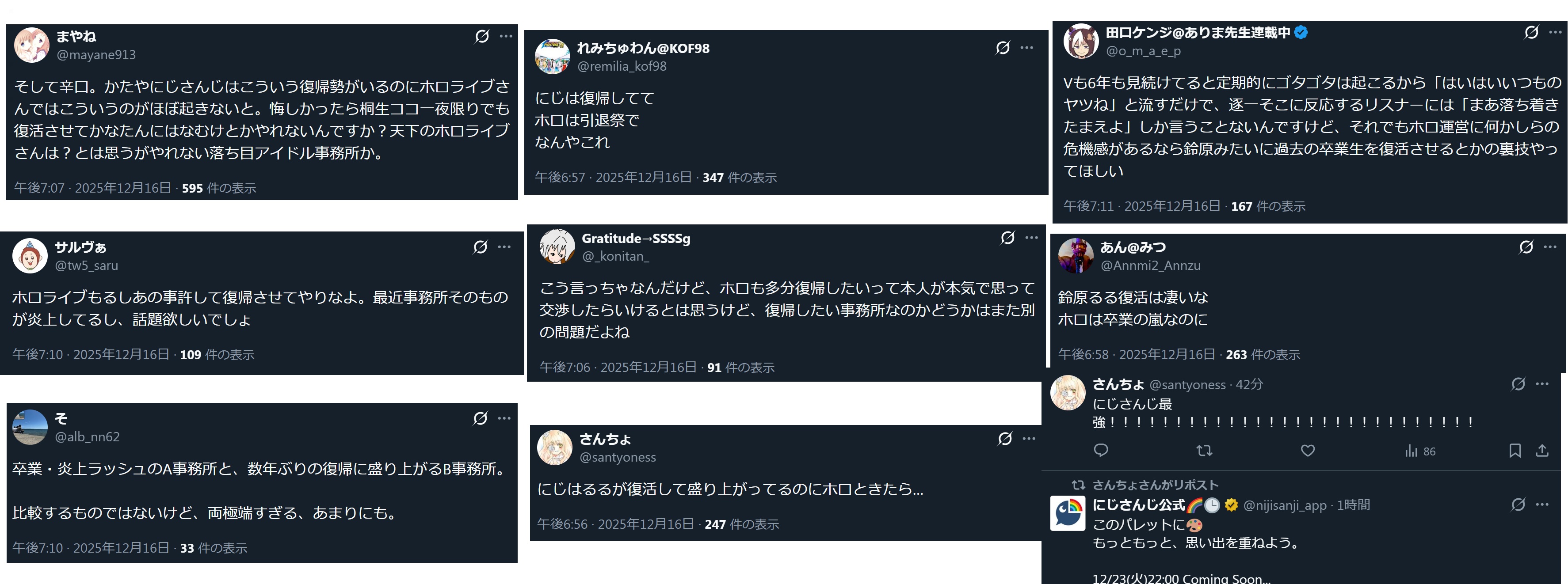 | … | 1825/12/16(火)21:00:11No.1383181621そうだねx3>>流石にもうにじさんじ信者が荒らしてるって主張は無理があると思うよ |