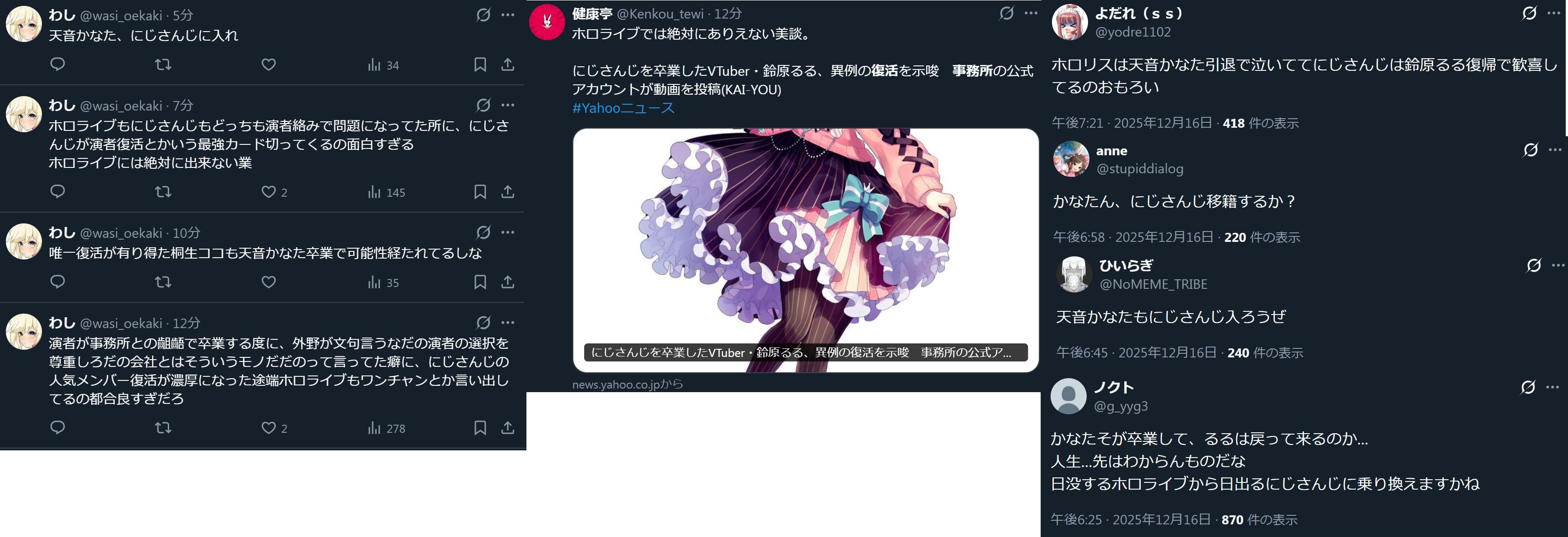 | … | 6025/12/16(火)21:13:32No.1383187447+>>にじさんじが盛り上がる話題のはずにはずなのにホロ粘着に夢中なのもうにじリスが一番のにじ粘着だろ |