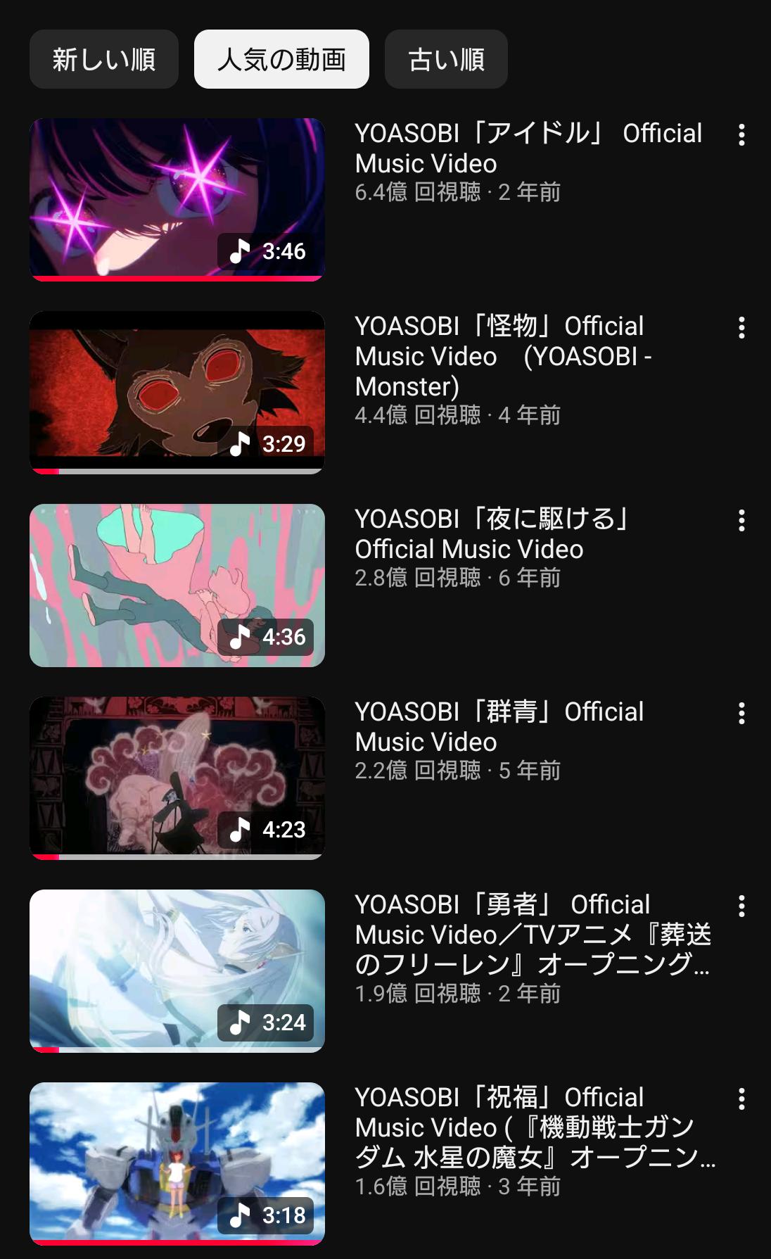 YOASOBIの公式YouTubeだと再生トップがアイドルで2位が怪物だね