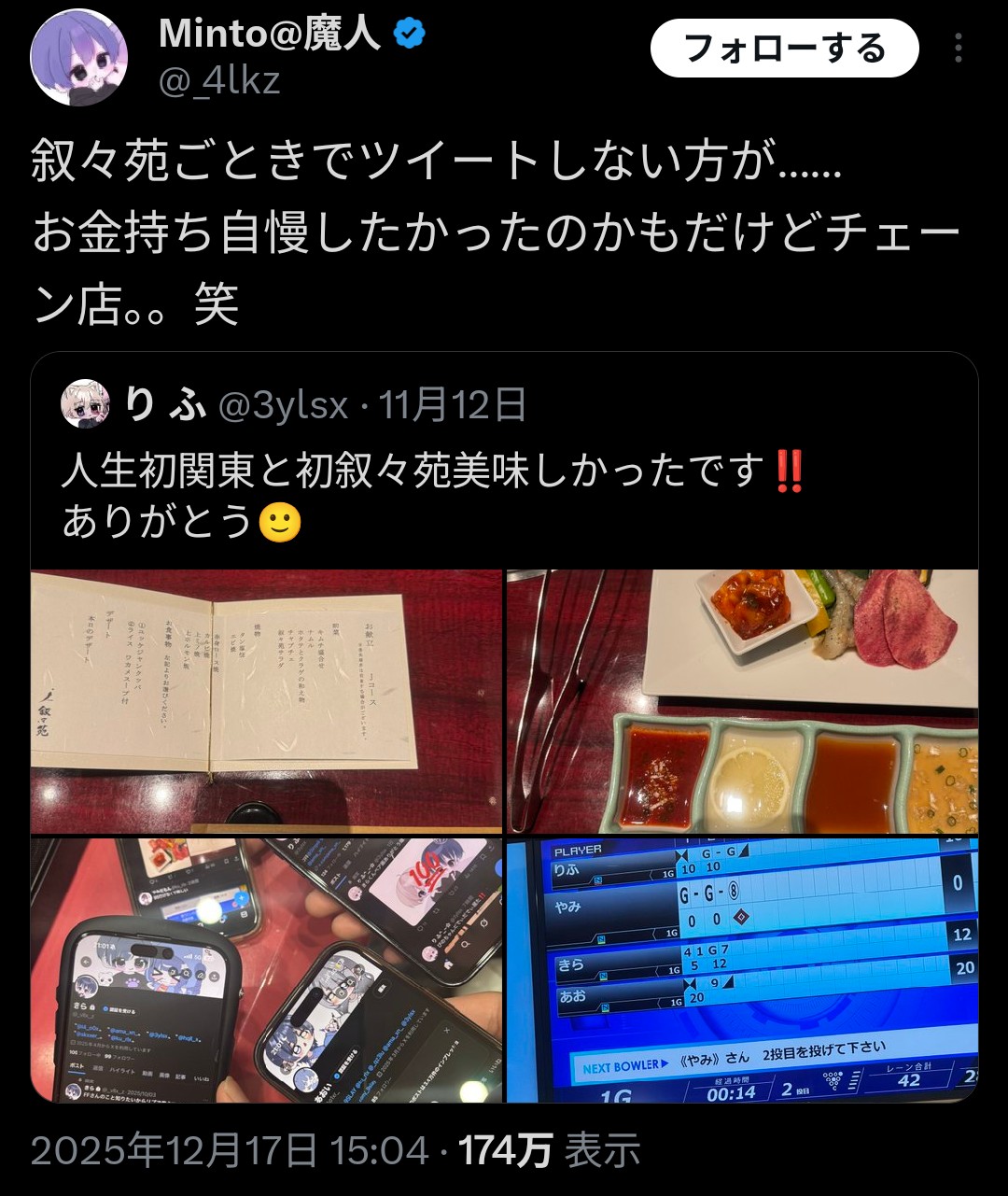 | … | 5925/12/17(水)21:54:14No.1383512151そうだねx12>叙々苑でボウリングするってそもそもかなりやばいレベルの金持ちなのでは |