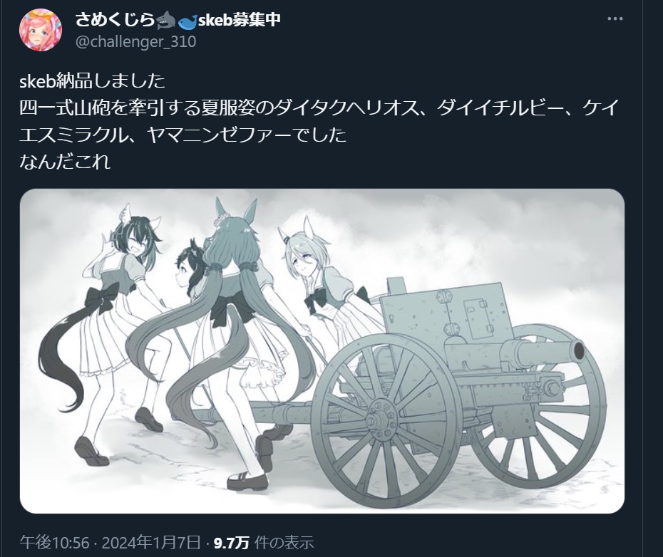 | … | 425/12/18(木)00:45:10No.1383574256そうだねx7野戦砲をウマが運ぶのは普通のことでは? |