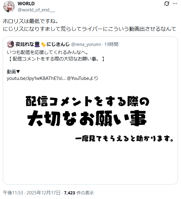 ライバーからの注意喚起程度でここまで暴れるとは思えないから別の何かが起きてると思うんだけど
