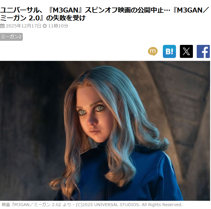 | … | 13125/12/18(木)16:14:43No.1383717836+そもそも最初のミーガンも日本で6億だからそんなにヒットしてない |