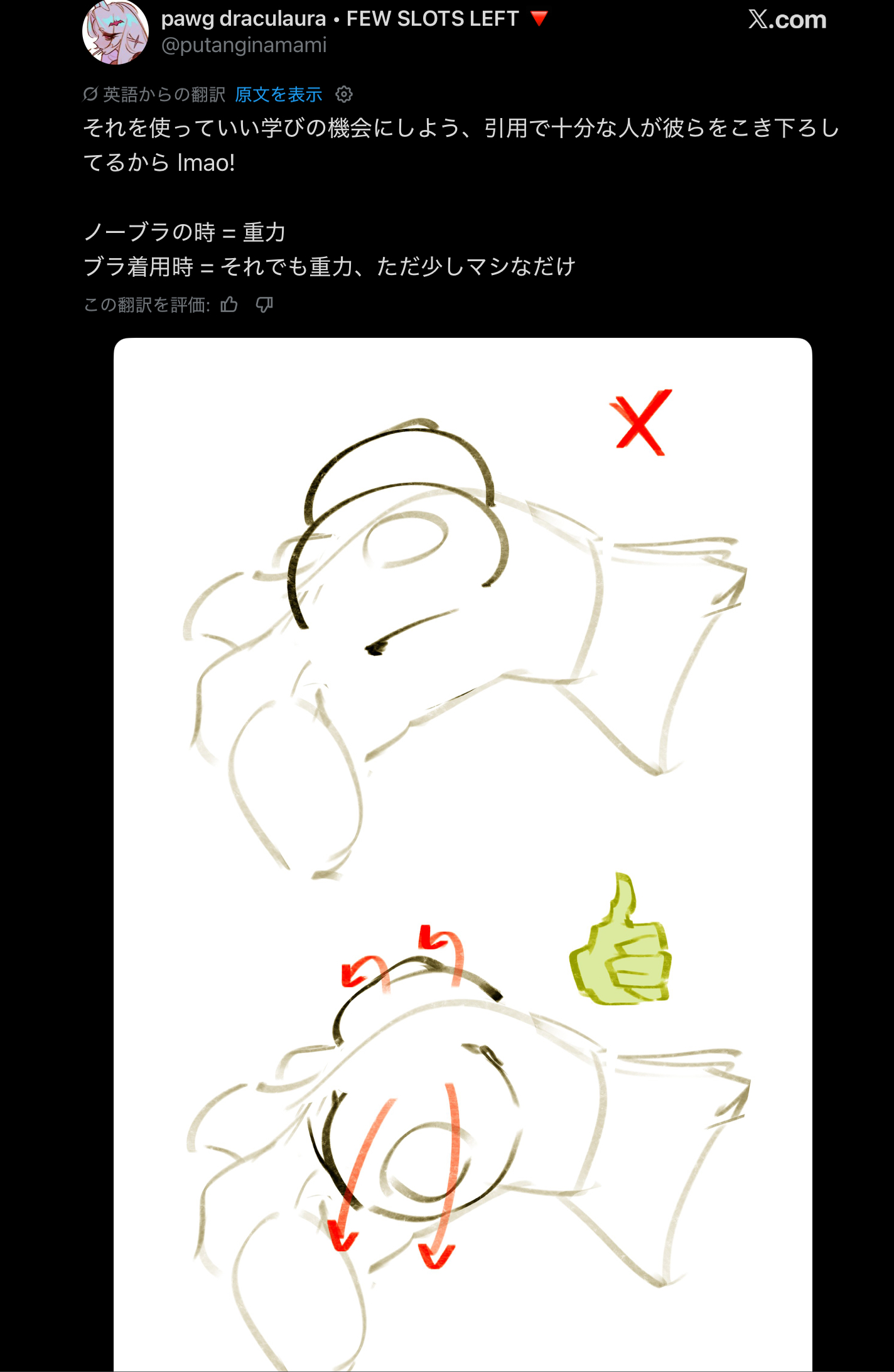 | … | 625/12/18(木)13:51:52No.1383686857そうだねx3仰向けになるとおっぱいが平たく外向くのは分かるんだけど |
