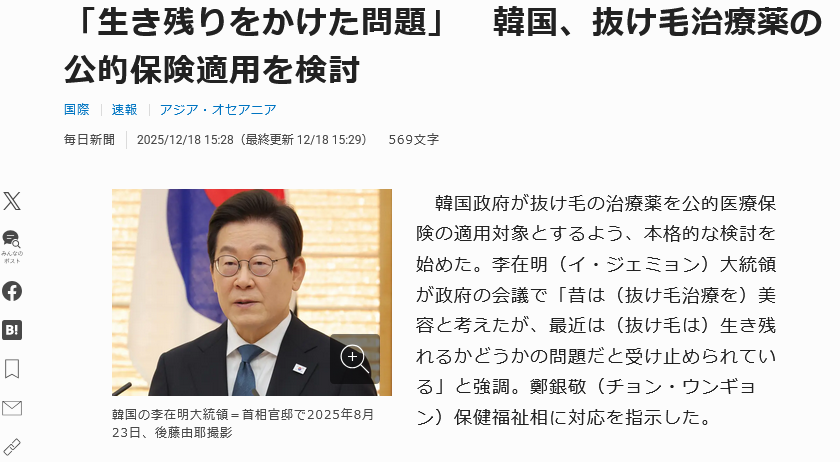 「生き残りをかけた問題」 韓国、抜け毛治療薬の公的保険適用を検討