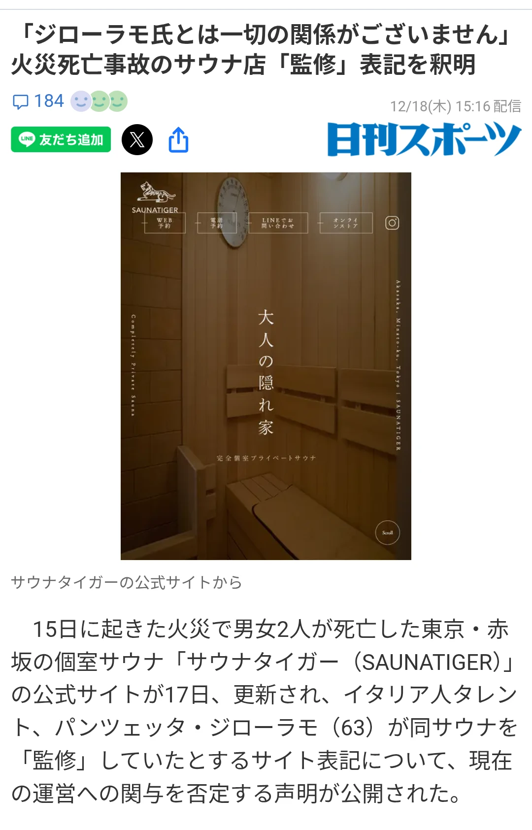 | … | 10925/12/18(木)18:59:11No.1383756645+>これは、オープン当初の2022年9月から2024年2月までの期間、ジローラモ氏よりサウナタイガーのPRのご支援をいただき、その後も掲載が継続していたものです。なお、ジローラモ氏は店舗の運営管理に関与していたわけではございません。 |