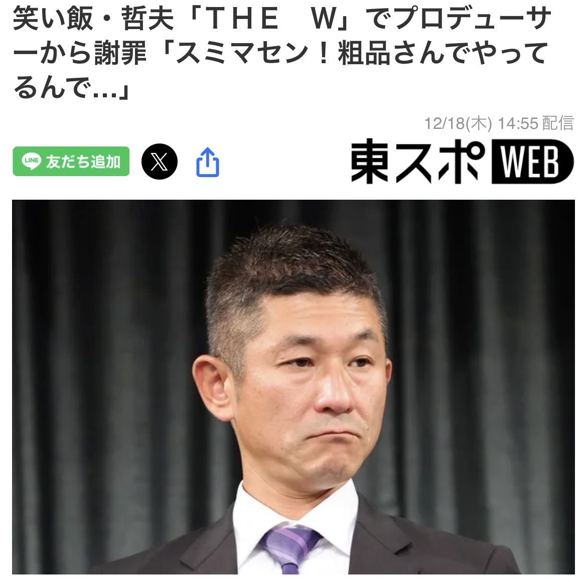 | … | 225/12/18(木)18:08:55No.1383742341そうだねx14>塙が「他の審査員、なんかかわいそうですよね。しょうがないんでしょうけど」と話すと、哲夫は「CM中、プロデューサーが謝りにきました。『スミマセン!粗品さんでやってるんで…』って。やかましいわ!しゃべらせろアホ!こっちもギャラもらってるんじゃー!って」と笑いながら明かした。 |