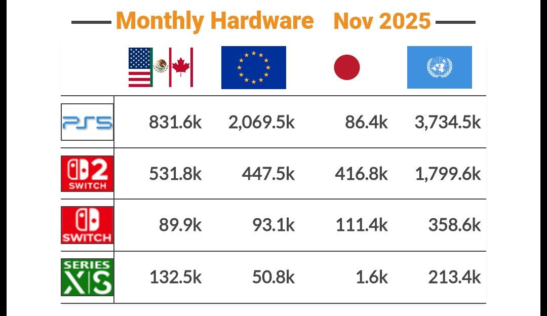 | … | 6125/12/19(金)12:41:46No.1383961674+>PCやスマホを含むあらゆるゲームハードウェアとソフト(ダウンロード含む)の売り上げが急減する中、PS5とNintendo Switch2だけがハードとソフト両方で売り上げを伸ばしている |