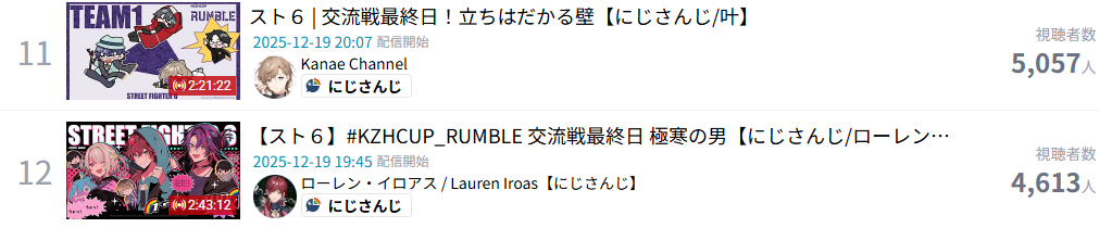 | … | 8025/12/19(金)22:35:06No.1384127630そうだねx9先月のデータだけど箱別で見ると平均同接はホロ12,768でにじが3,908だな |