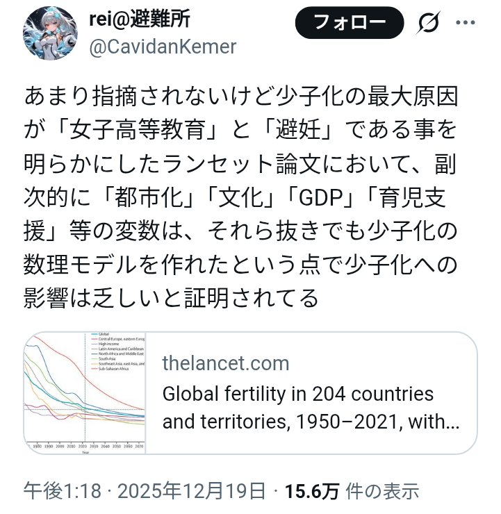 | … | 3025/12/20(土)01:45:18No.1384181804そうだねx13元論文読んだけどこれ少子化の要因じゃなくて出生率の地域的な変化の話じゃねーか |