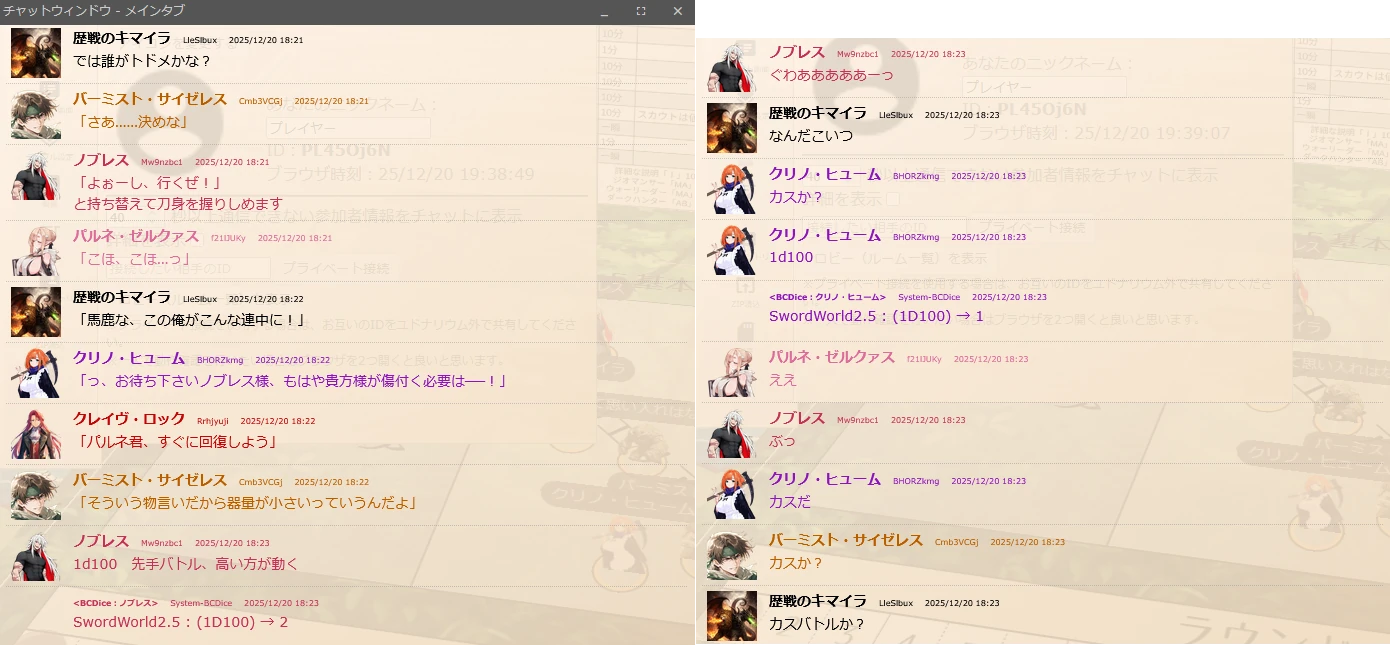 | … | 2625/12/20(土)19:38:12No.1384393913そうだねx3>>クライマックス戦闘も1d100で1と2の勝負かますし… |