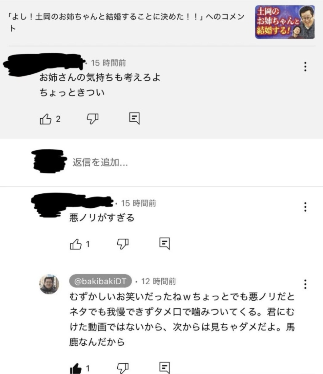 | … | 8425/12/20(土)23:44:06No.1384499641そうだねx3>コピペ朗読は土岡の企画なのに土岡は一切言われずにぐんぴぃだけが一生これで叩かれてるの本当におもろい |