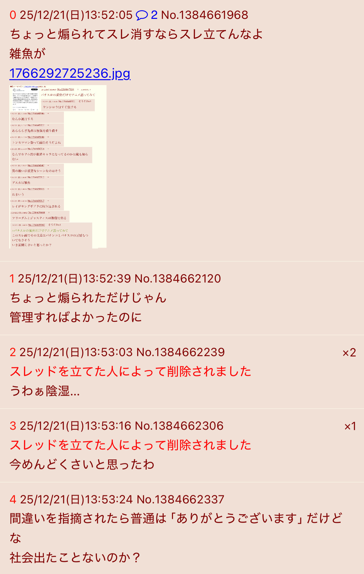 | … | 525/12/21(日)14:09:02No.1384666742+>ちょっと煽られてスレ消すならスレ立てんなよ |