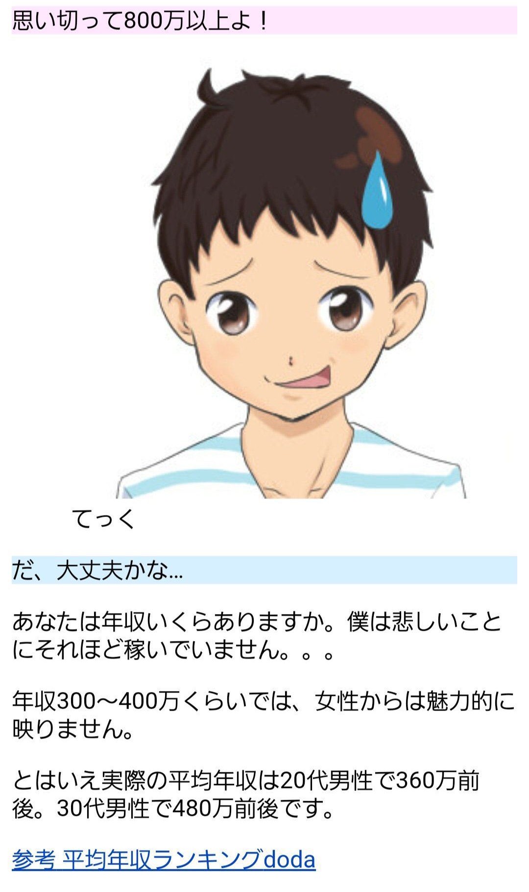 | … | 1825/12/21(日)16:34:12No.1384711772そうだねx4ちなみにこのコマな婚活してる時点で年収詐称してます |