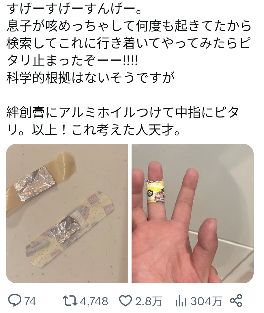 | … | 2225/12/21(日)16:04:56No.1384702638+アルミホイルっていう異物感を直接指に感じるからよりプラシーボ効果が高まるんじゃないか? |