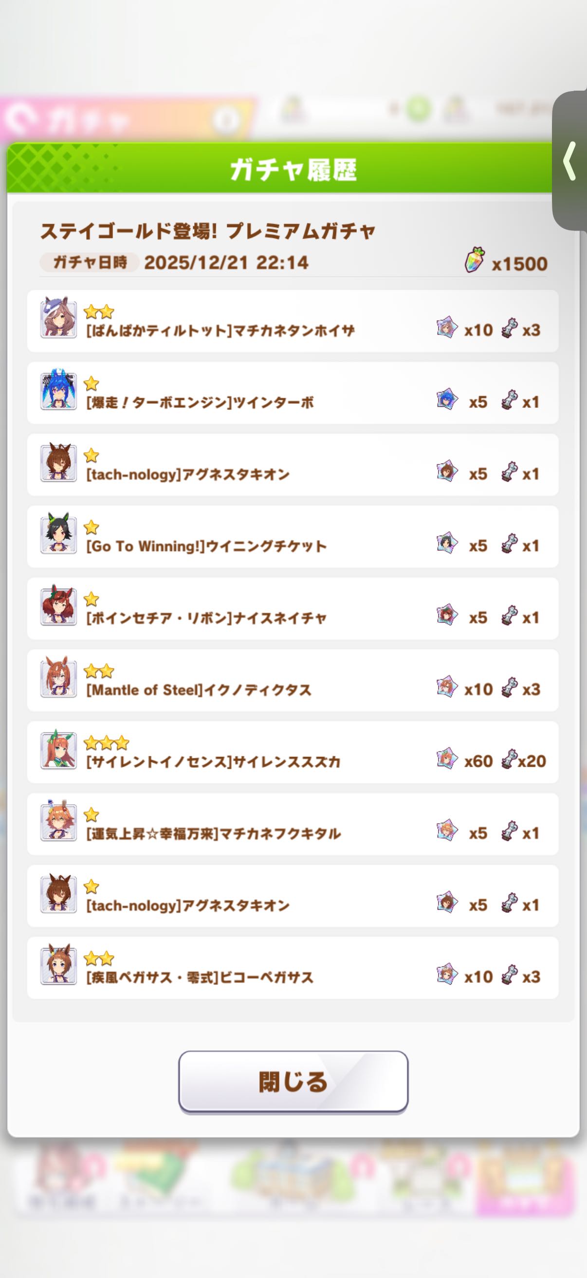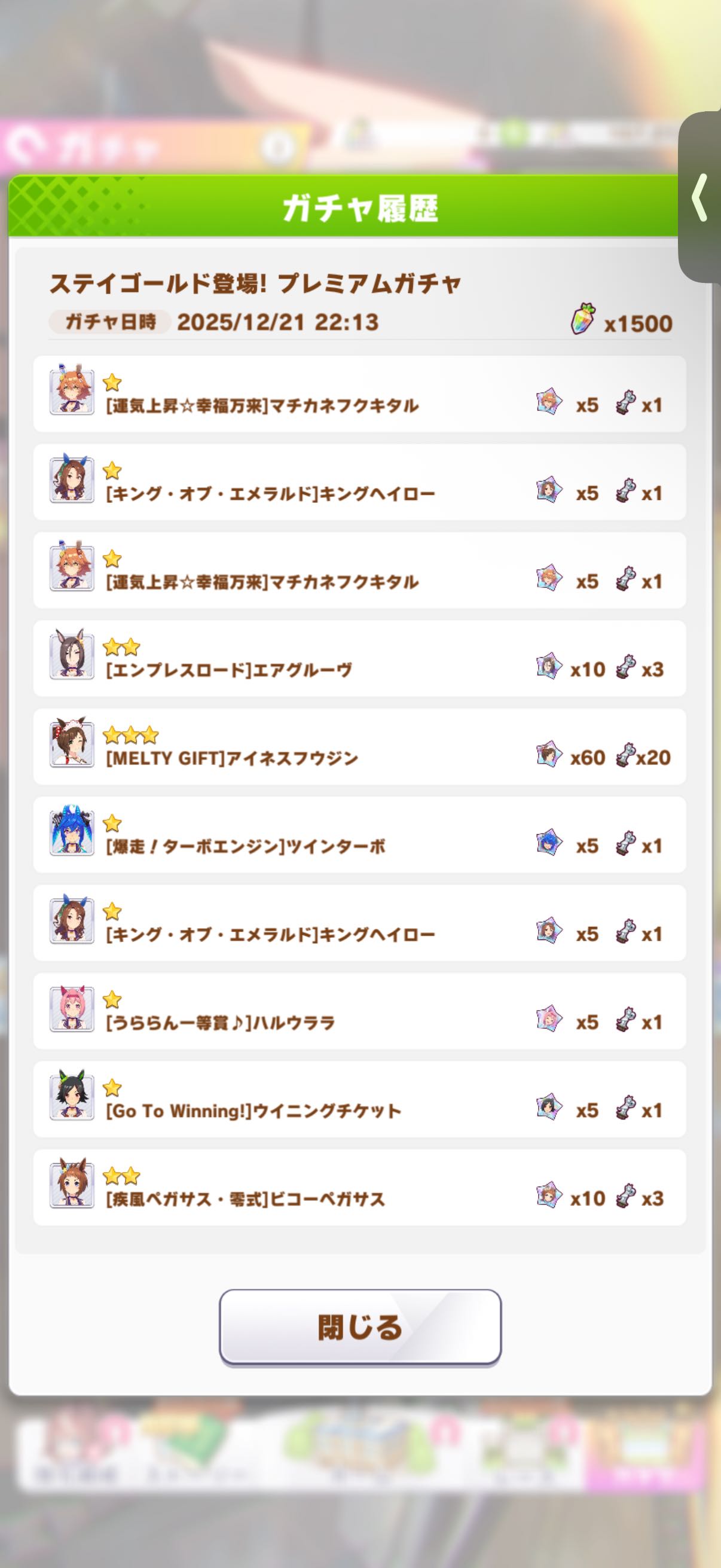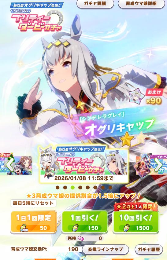 | … | 33825/12/21(日)22:33:31No.1384885780+オグリは良いけど初登場限定キャラはチャンミ云々の前にストーリー読めないのが辛いのだ ので引いたのだ |