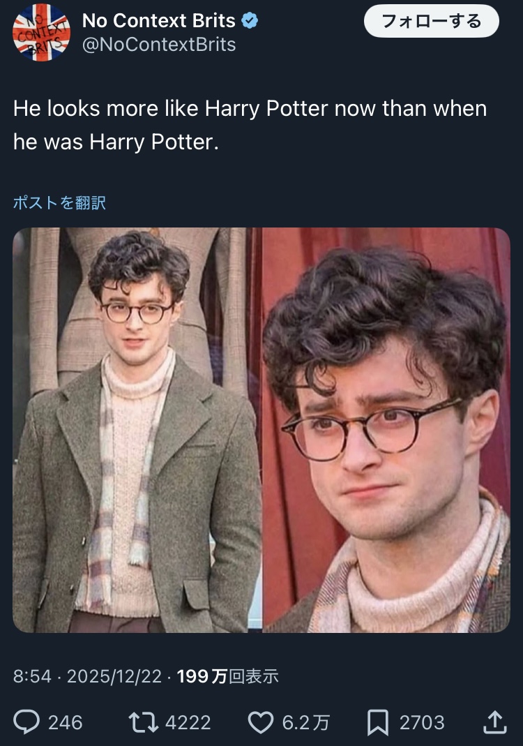 | … | 325/12/22(月)15:13:27No.1385065252+むしろハリーポッターだった頃が長すぎて他の役できるんだろうか |