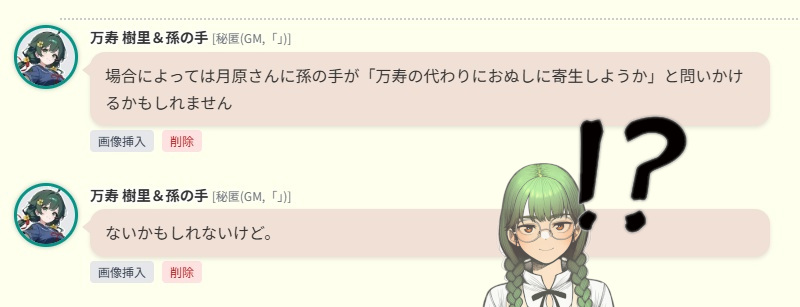 | … | 225/12/22(月)19:28:40No.1385131550そうだねx1チャッピーと年末突発用シナリオについて話し合ってるんぬ! |