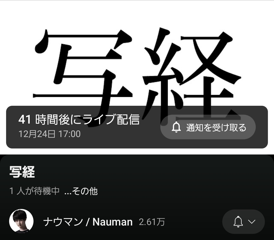 | … | 3925/12/22(月)23:03:37No.1385219675+>今年のナウマン写経配信無いらしいな |
