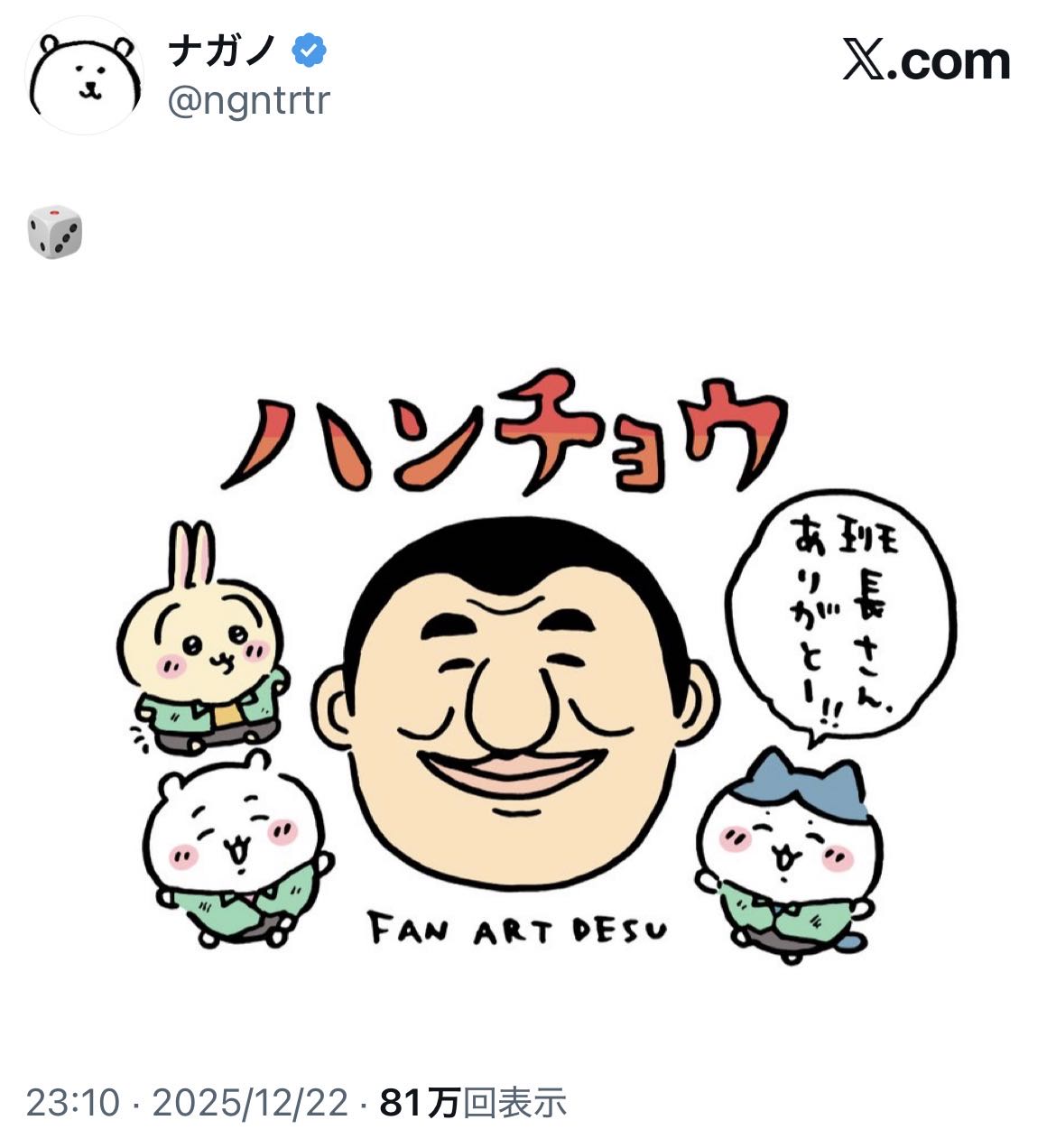 | … | 1825/12/23(火)00:59:19No.1385259612+>ハンチョウにちいかわが出演したお返しみたいなもんだから… |