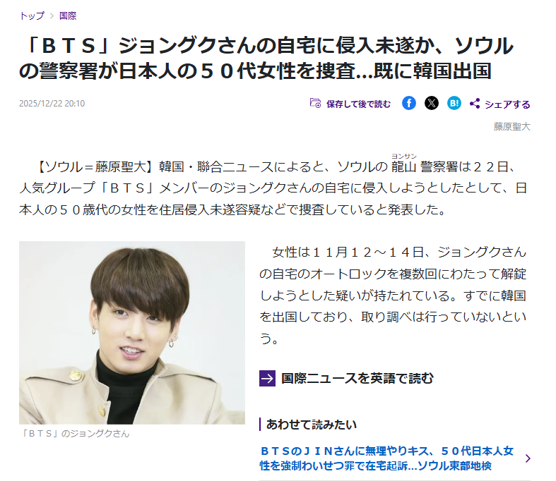 | … | 10525/12/23(火)07:48:24No.1385292185+>BTSは中国人のおばさんにも住居侵入されてた気がする |