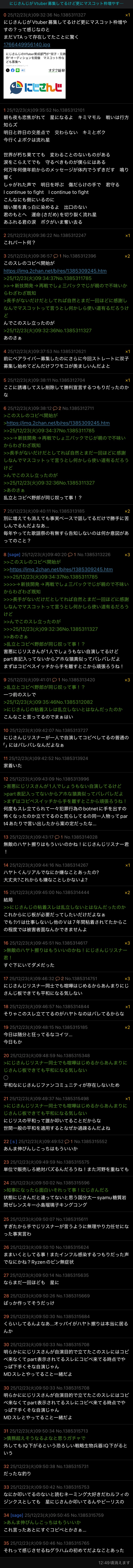 | … | 2025/12/23(火)09:56:20No.1385317193そうだねx7>「ライバー募集の話はにじ叩き」というにじリスの見解が得られたので |