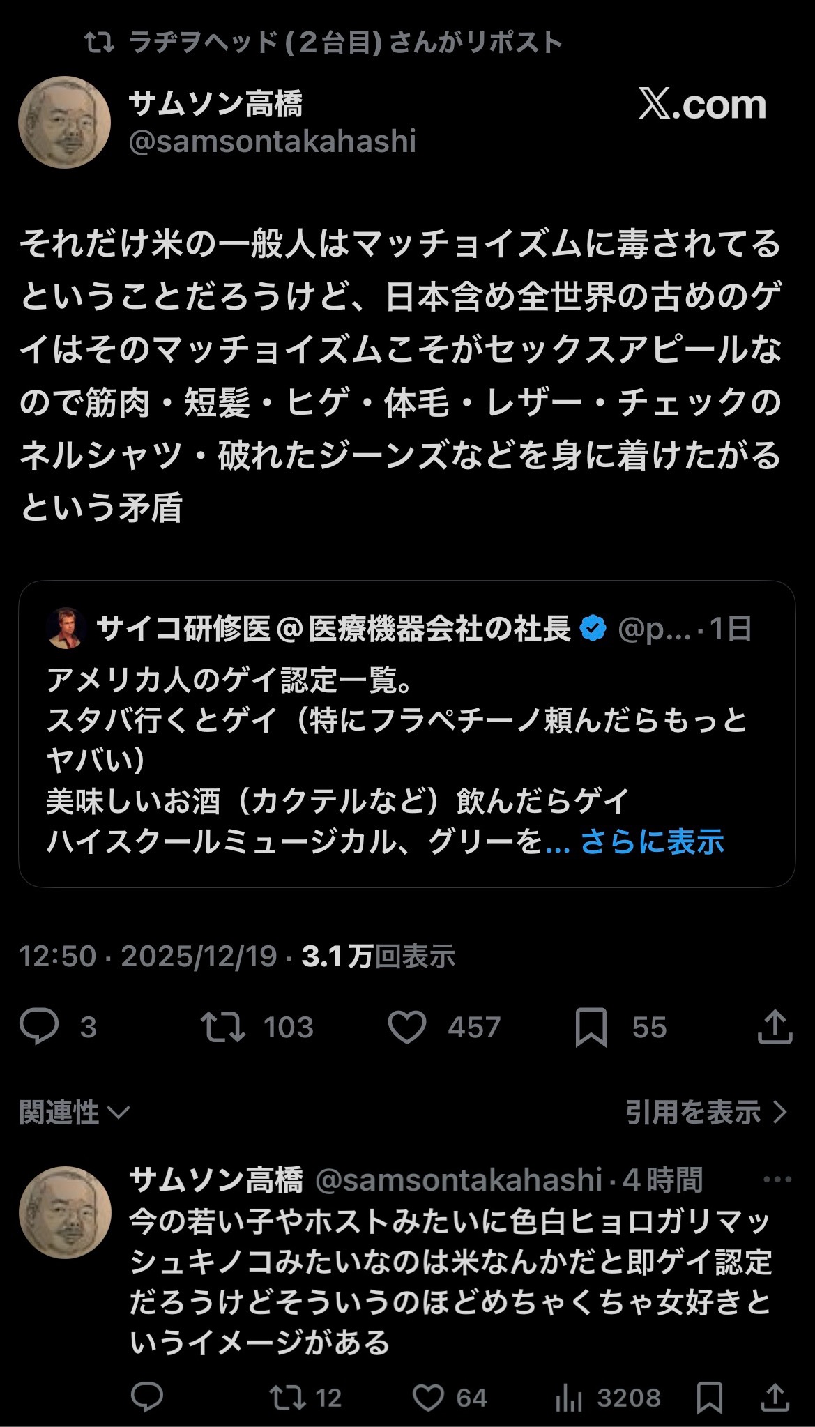 | … | 9825/12/23(火)13:04:18No.1385365337+ホモソーシャルとかマチズモってゲイだと思うんだけどアメリカ人からすると違うんだろうか |
