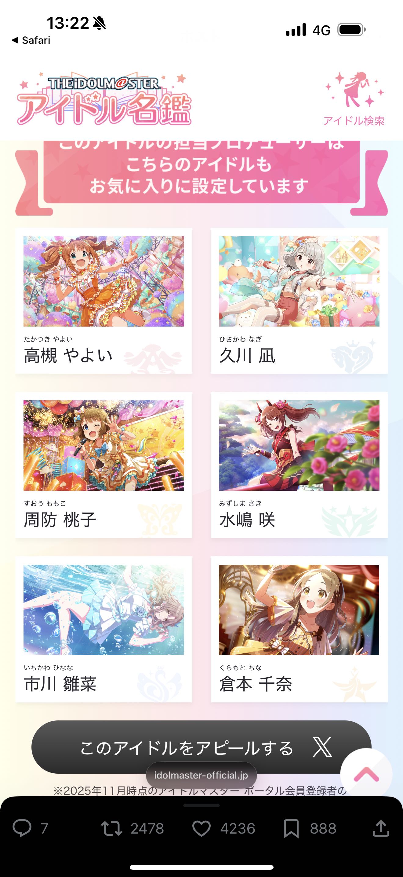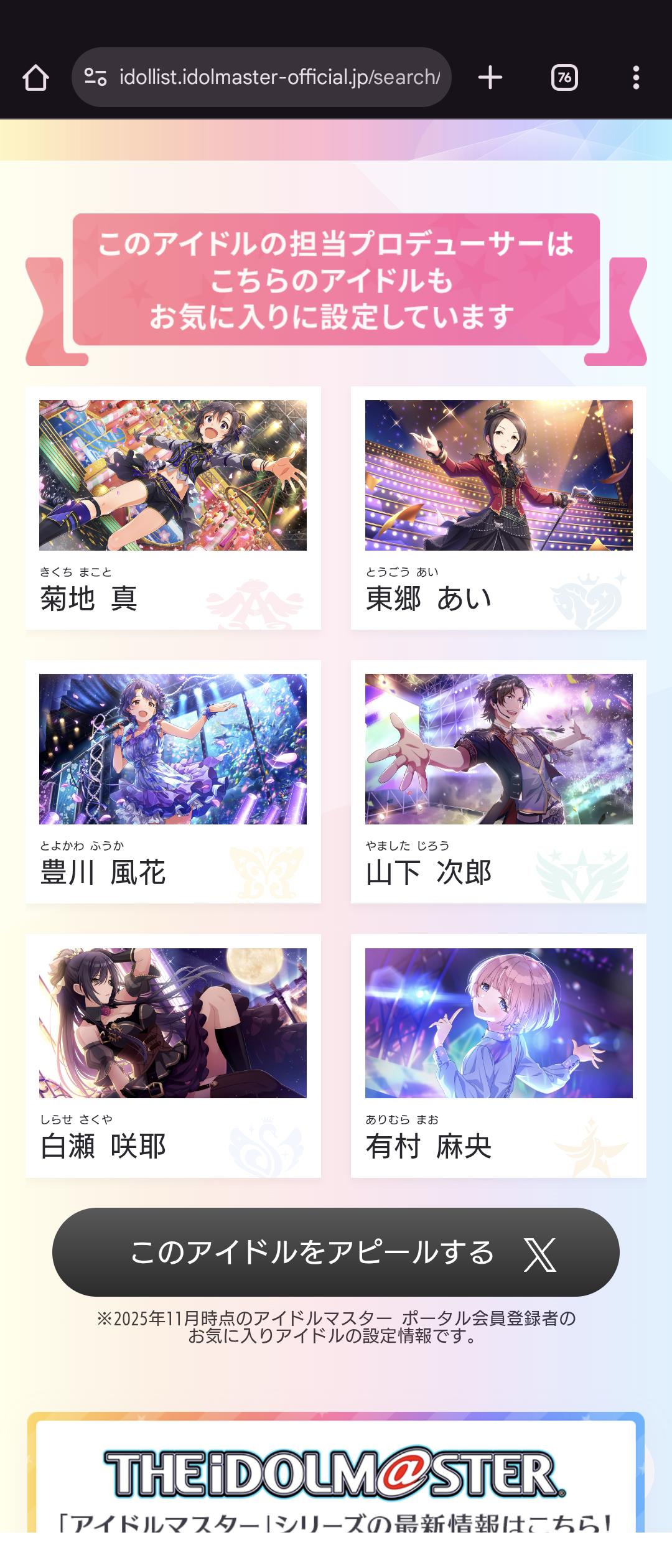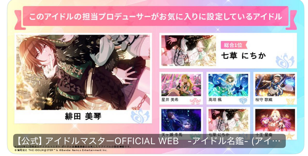 | … | 22025/12/23(火)14:56:47No.1385390422+>母数利で勝負されて一番上しか表示されないから各アイドルのつながりで一番好きなキャラ本当にこれなの?っていうの多くない? |