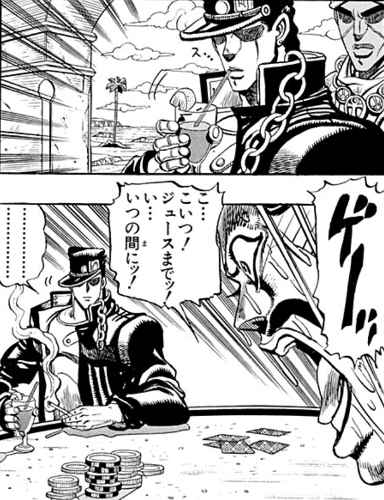 | … | 32125/12/24(水)13:15:13No.1385670727+>>表面張力勝負を仕掛けたのはジョセフだし咄嗟にチョコのイカサマを閃く対応力が凄すぎる |