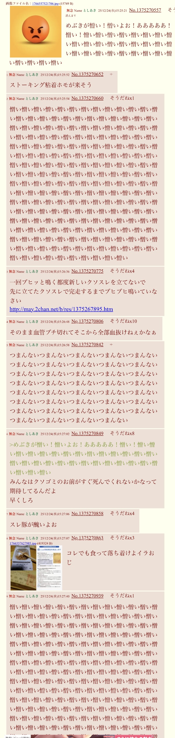 | … | 625/12/25(木)04:13:04No.1385918501+荒らしの作ったネットコミュニティに憎しみ募らせるとか丼だけ底辺なの |