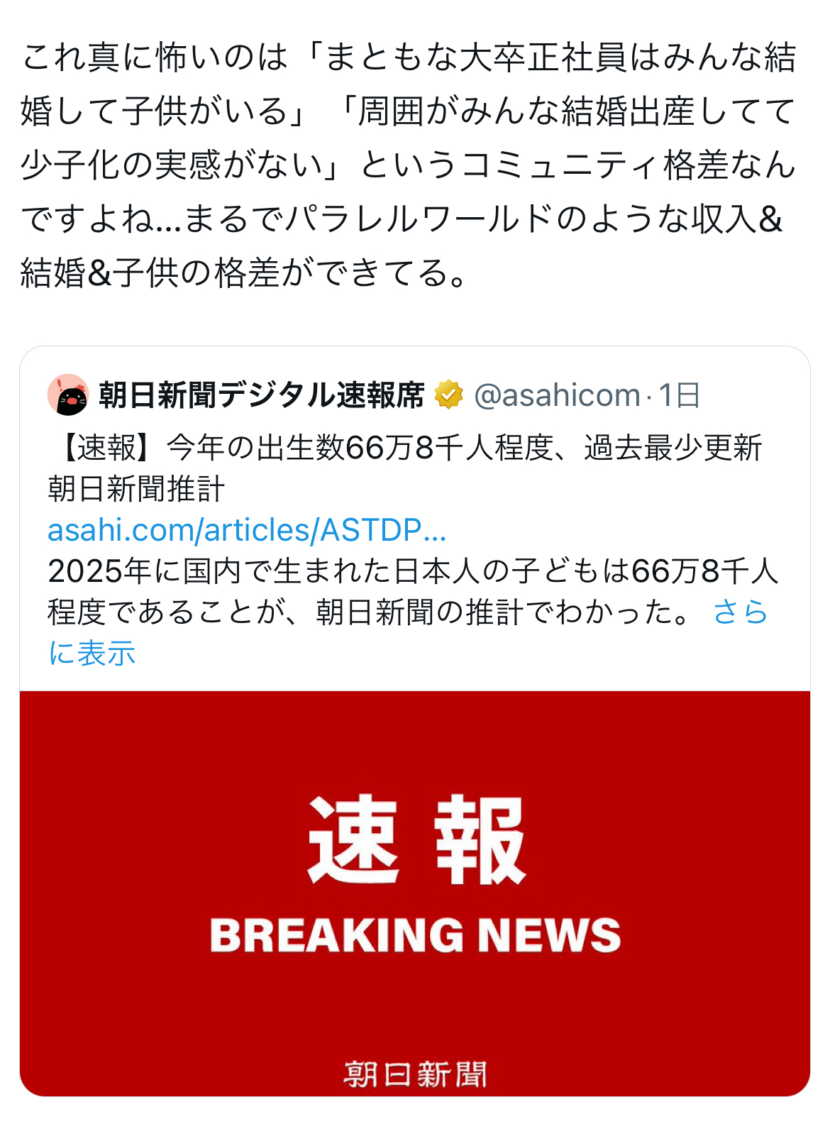 | … | 1625/12/25(木)10:29:34No.1385956301そうだねx4むしろ高卒や高中退とかのできちゃった婚やシングルマザーがボコスカ子供産んで貧困に苦しんでいるという印象があるが… |