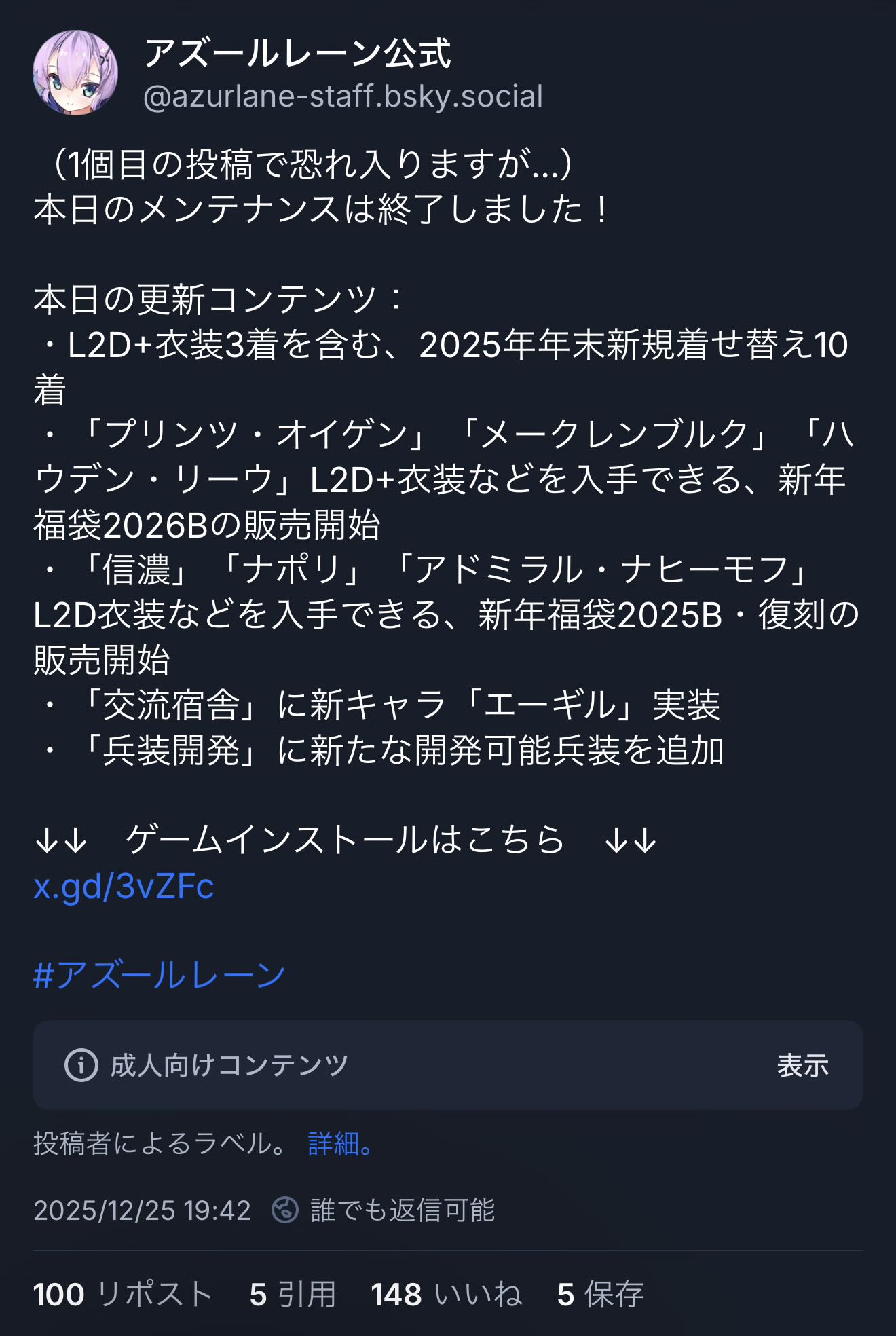| … | 4225/12/25(木)19:43:04No.1386090664+アズレン公式につられてblueskyにアカ作ってみたけど SNSで興味の有無とか設定しなおすのやっぱ面倒だな…仕方ないけど |