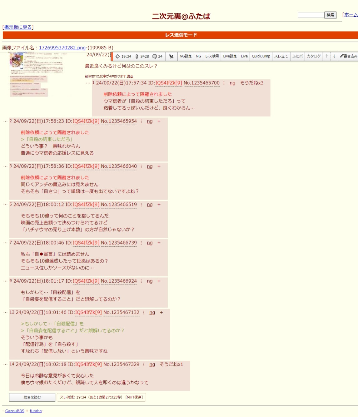 | … | 8425/12/25(木)22:08:06No.1386149929そうだねx3ここの粘着アホしかいないから… |