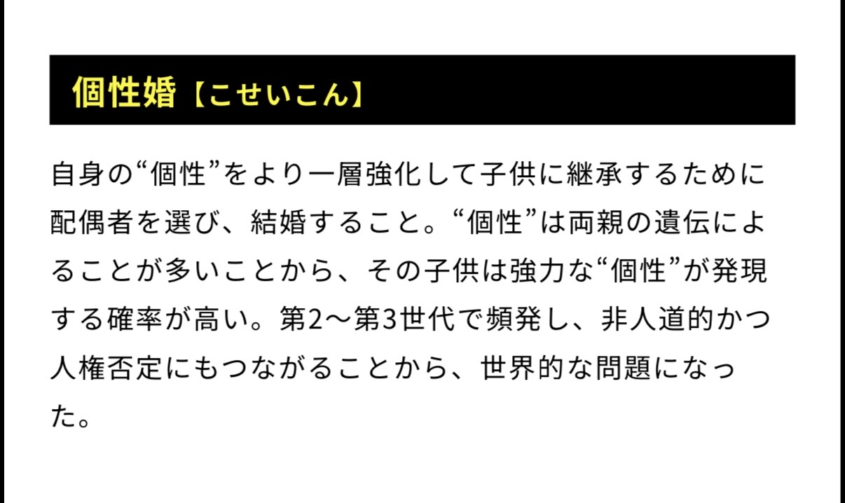 | … | 17025/12/26(金)11:02:20No.1386273826+>個性婚は非人道的として社会問題になってたのあたり何があったんだろう個性婚 |