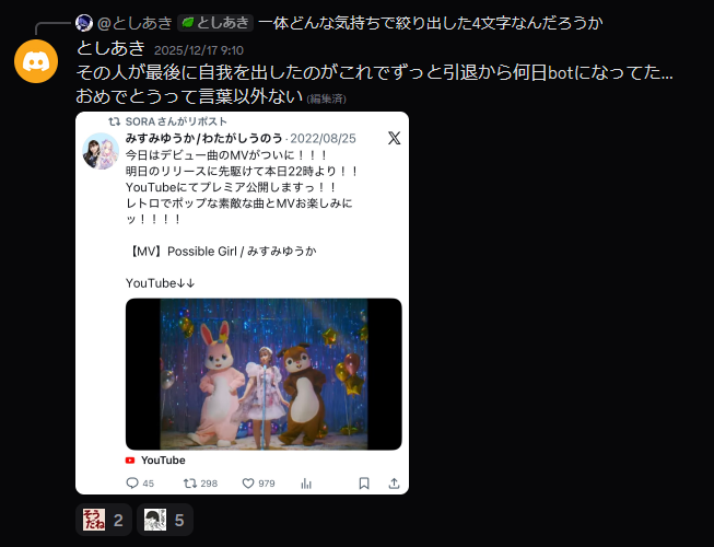 | … | 1025/12/26(金)12:24:27No.1386292426そうだねx4>もうイジりづらい枠に入ってしまった… |