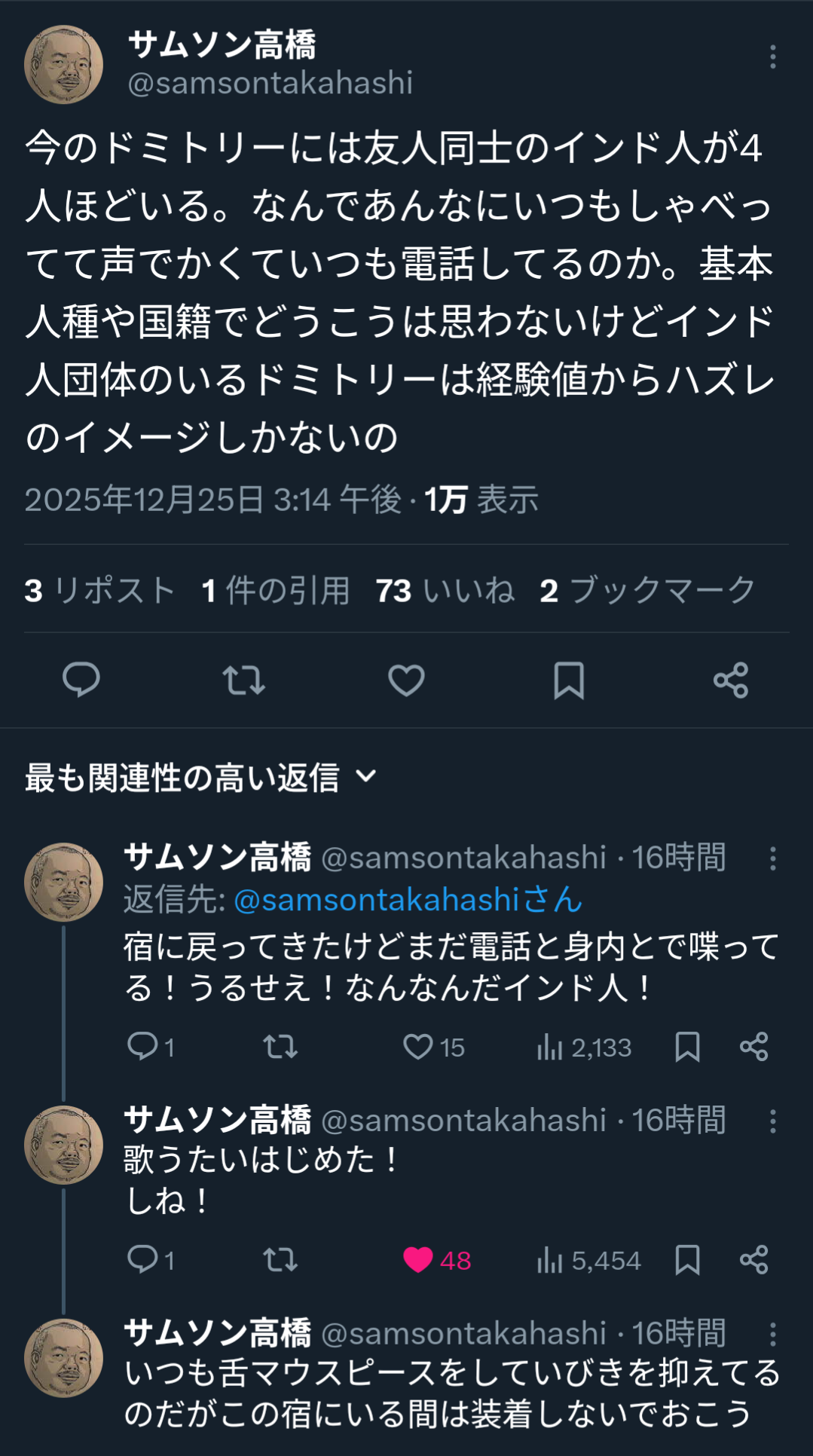 | … | 625/12/26(金)15:14:43No.1386329637+中国人や韓国人は主張したい時に感情的に大きい声になるけどインド人は常に感情的で声デカい |