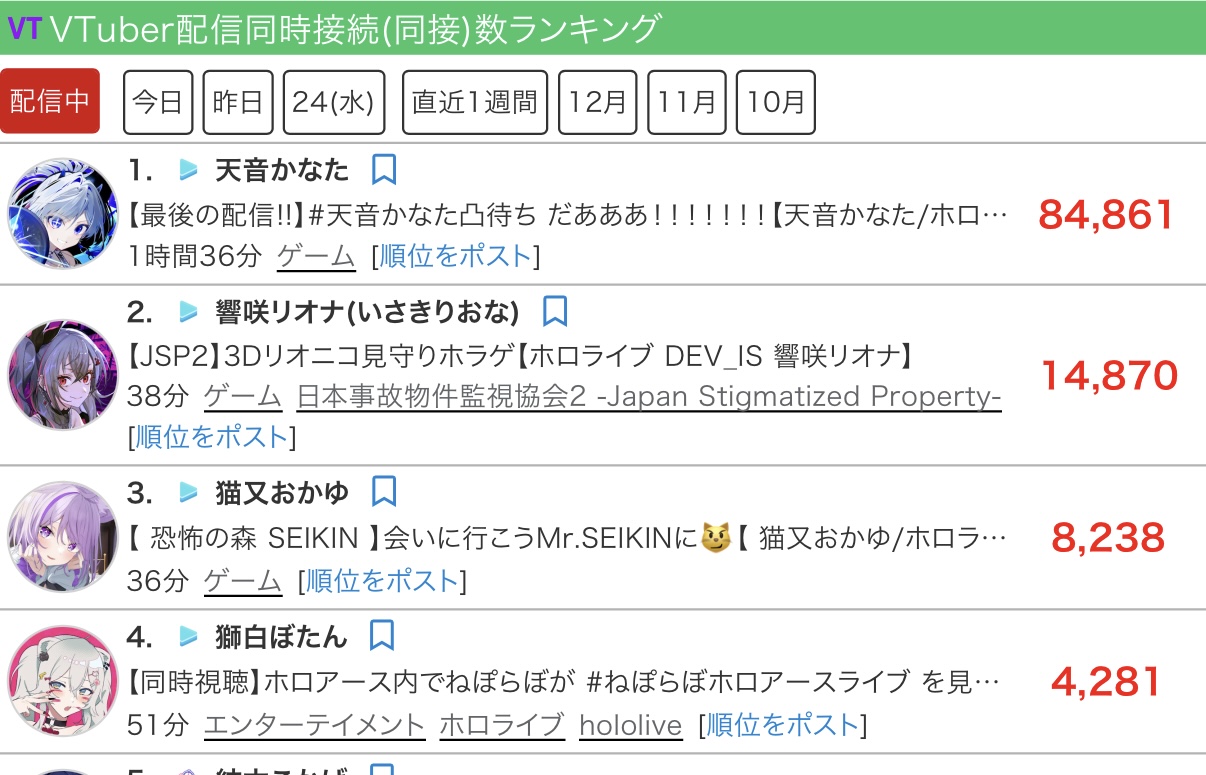 | … | 825/12/26(金)19:20:53 ID:446Ck4O2No.1386389466そうだねx8ホロメンやういママの倍ぐらいなっげえなライバーの占有時間… |