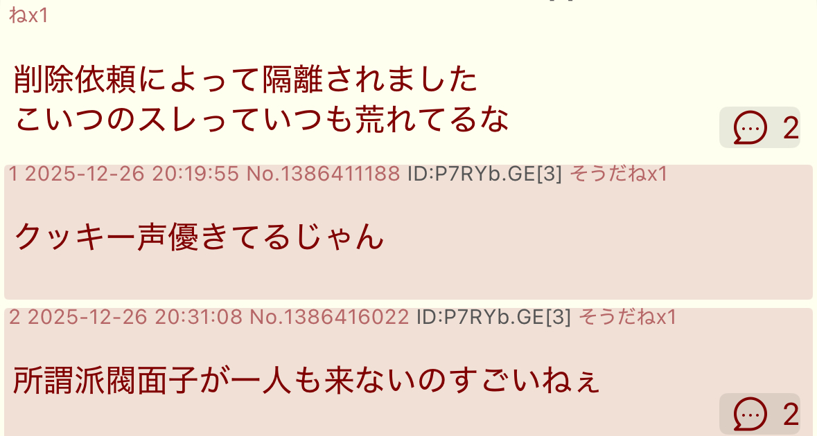| … | 1025/12/26(金)19:22:05 ID:NVQCmPE6No.1386389901+酷いなこれ |