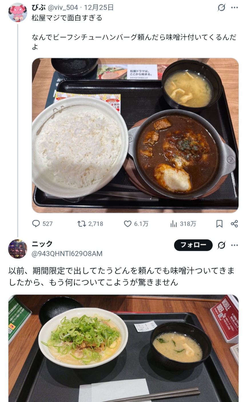 | … | 2025/12/26(金)22:23:34No.1386459673そうだねx2牛丼チェーン、「味噌汁があるから松屋に行く」みたいな人も結構いるらしいんだよね |