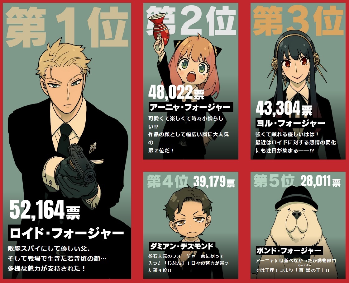 | … | 9825/12/27(土)19:10:49No.1386724564+アーニャとロイドを票分散させずにそれぞれ一つにまとめたらモジャモジャも10位圏内だったんじゃないか…? |