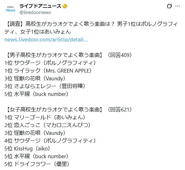 | … | 6225/12/27(土)20:20:34No.1386752369+>2位以下は最近の曲多いから最近の曲が歌いづらいからって理由ではなさそう |