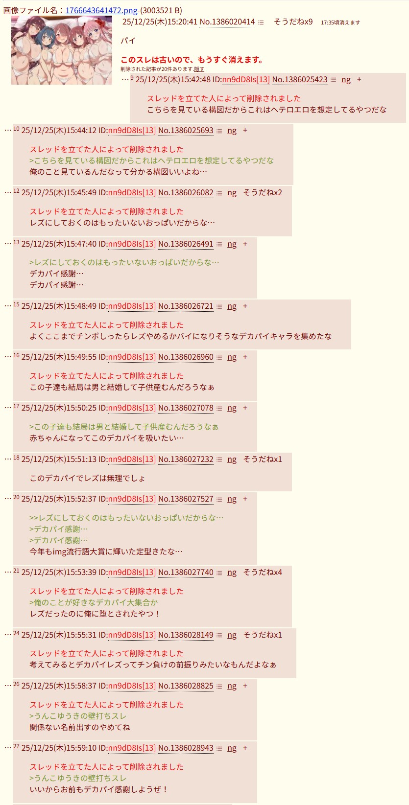 | … | 2025/12/28(日)07:31:20No.1386900653+スレッドを立てた人によって削除されました |