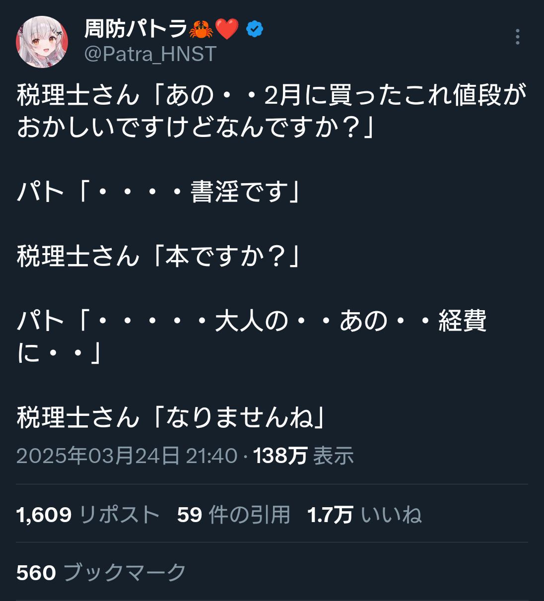 | … | 6625/12/28(日)14:10:52No.1386994834そうだねx1みんな怪しく見えてしまう |