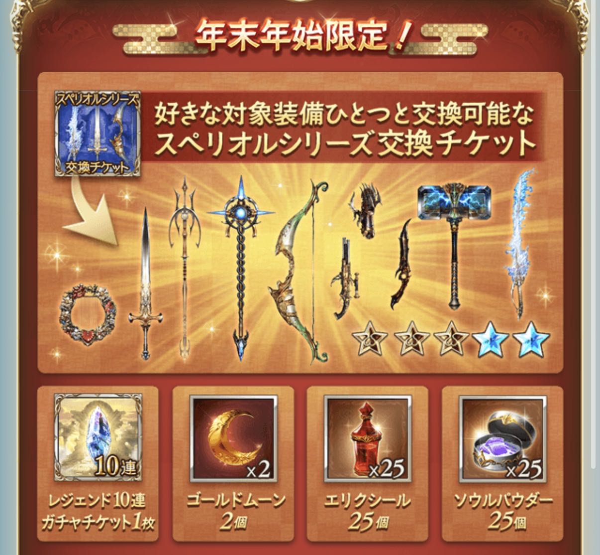 | … | 97125/12/28(日)19:02:00No.1387093772+・「スペリオルシリーズ交換チケット」は購入すると直接アイテム一覧に贈られ、そのほかのアイテムは期限なしのプレゼントリストに贈られます。 |
